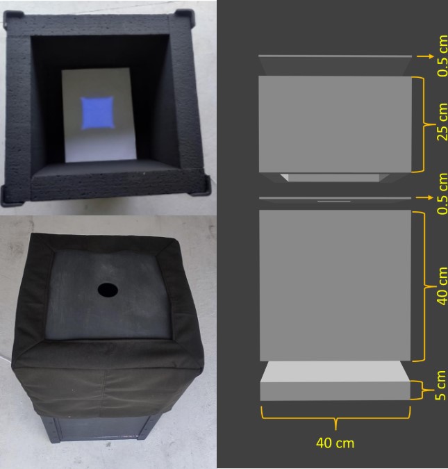 Symulacje wykazały, że optymalne rozproszenie światła można osiągnąć, używając materiałów o wysokiej dyfuzyjności, takich jak matowa folia aluminiowa lub folia teflonowa (PTFE). W zbudowanej komorze zastosowano folię aluminiową, ponieważ była łatwiej dostępna.