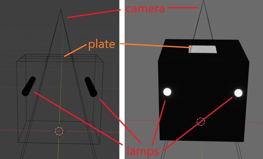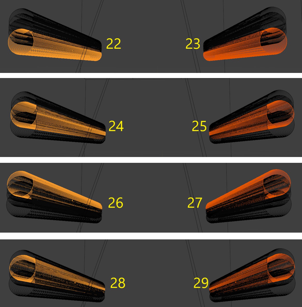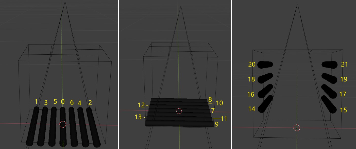 Symulacje w Blenderze kontynuowano, analizując wpływ różnych konfiguracji oświetlenia (według poniższego schematu) oraz materiałów wyściółki komory (PTFE vs. czarna farba lateksowa). Monochromatyczne obrazy (16-bitowe TIFF) były następnie przetwarzane w ImageJ ("Fiji"): zmniejszano ich rozmiar do 1×128 pikseli i zwiększano głębię koloru do 32 bitów. Jako kryterium optymalizacji wykorzystano współczynnik jednolitości oświetlenia (różnica między maksymalną a minimalną jasnością, podzielona przez jasność maksymalną), dążąc do jego minimalizacji poprzez wirtualne przesuwanie źródeł światła w osiach x i z.