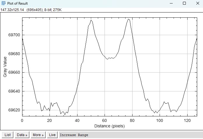 Podejście to udoskonalinaliliśmy, wprowadzając iteracyjną regresję wielomianową. Po wstępnej subtrakcji tła, program wykrywał plamki, a następnie ponownie rekonstruował tło z wykluczeniem pikseli, które należały do uprzednio wykrytych plamek. Choć przyniosło to pewną poprawę, powtarzalność pomiarów wzrosła jedynie marginalnie (o 2-3%), co nadal było niezadowalające.