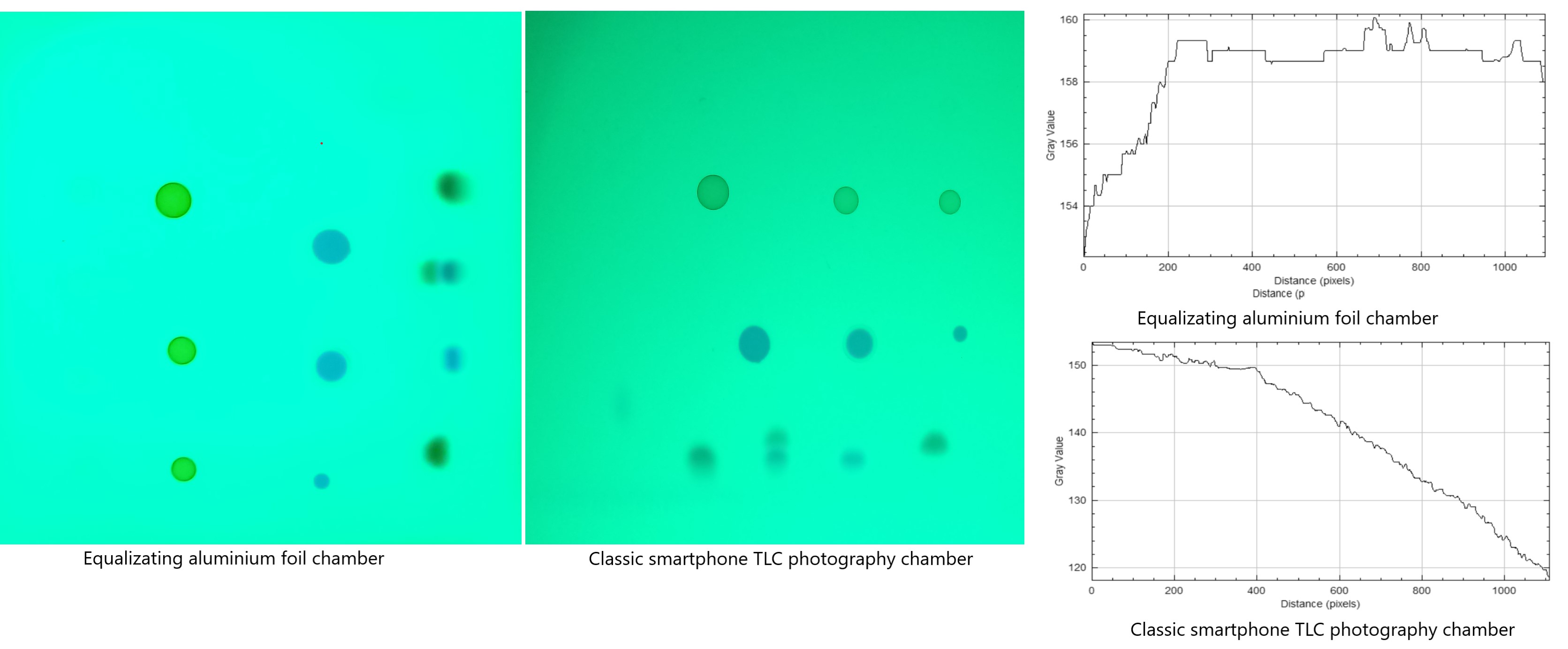 Podsumowując, w idealnym świecie tło na zdjęciu powinno być idealnie jednolite. Niestety, z powodu niedoskonałości sprzętu fotograficznego i, co najważniejsze, nierównomiernego oświetlenia, tak nie jest. W tradycyjnych komorach do fotografii płytka HPTLC jest mocniej oświetlona w miejscu bliższym lampie. Nasze rozwiązanie eliminuje ten problem, a to otwiera drogę do dokładniejszych i szybszych analiz, bez potrzeby skomplikowanej obróbki cyfrowej.