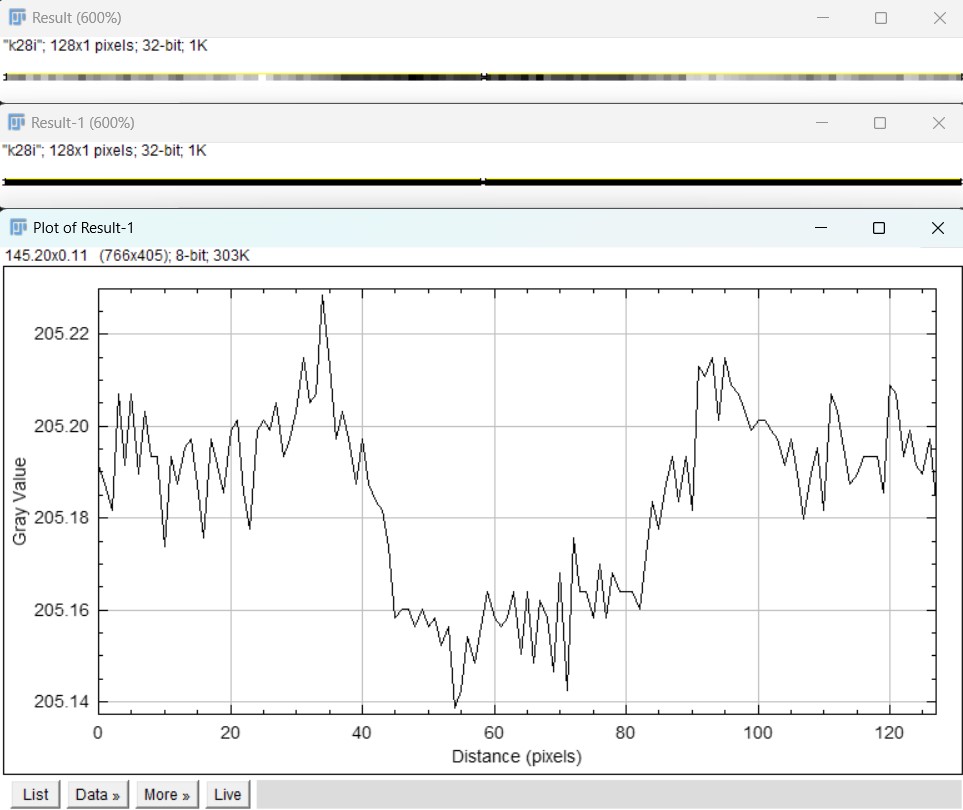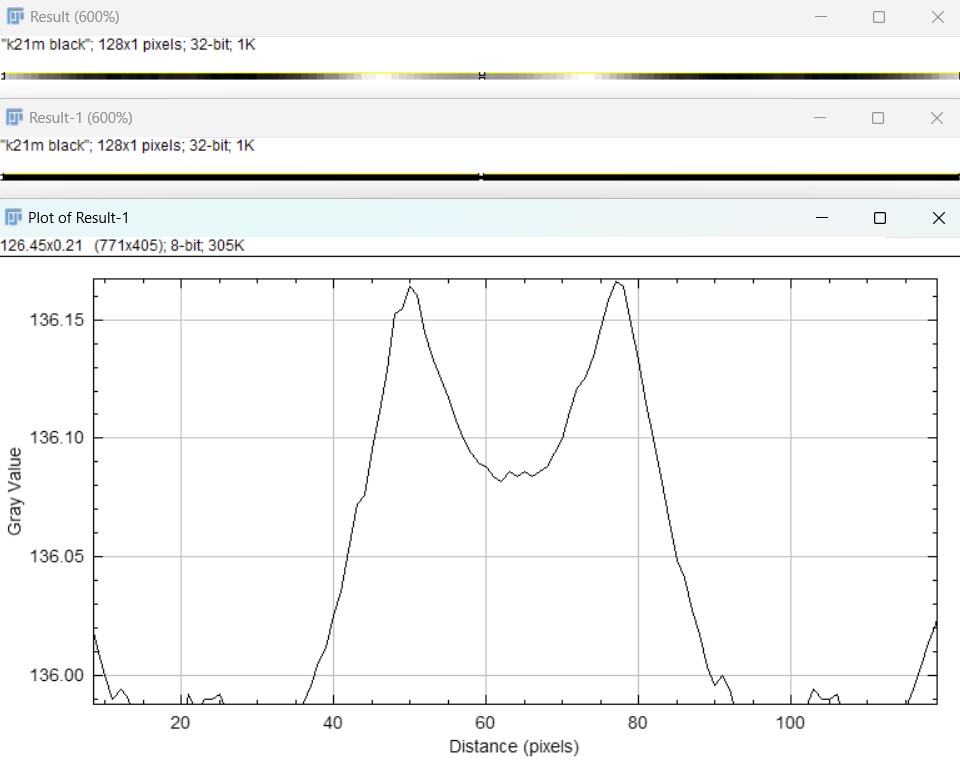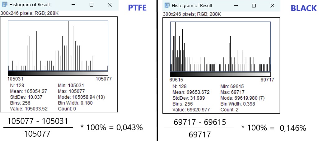 Te liczby są bardzo ważne, ponieważ potencjalny aparat z 9-bitową głębią koloru jest w stanie rozróżnić różnicę na poziomie 0,195%, a kamera z 11-bitową matrycą aż 0,048%. Oznacza to, że w idealnych warunkach, zarówno przy użyciu komory z czarnym materiałem, jak i z folią PTFE, nasze rozwiązanie sprawi, że dla oka przeciętnej kamery (8 z bitową głębią - 0,39%) każdy fragment czystej płytki będzie miał taką samą jasność.